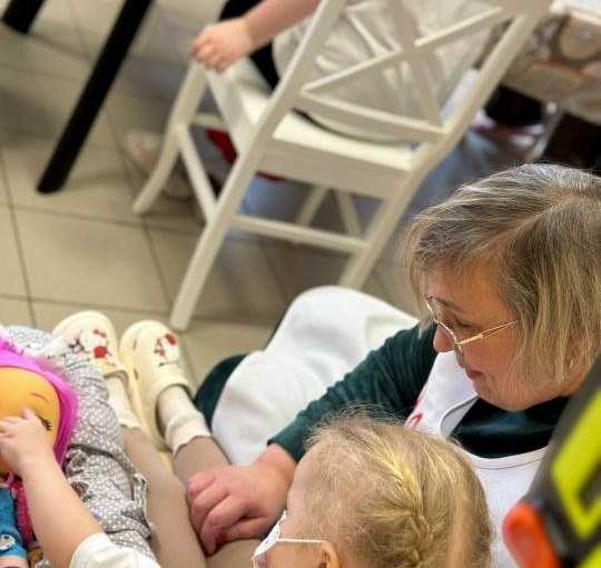 Елена Алексеевна вместе с Ульяной уговаривают куклу не плакать.