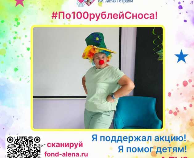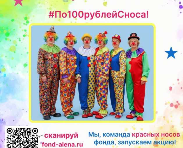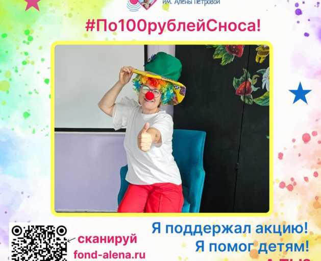 Приглашаем вас принять участие в весёлой и доброй акции к 1 апреля #По100рублейСноса. Мы просим вас пожертвовать от 100 рублей в помощь детям с онкологическими заболеваниями. На собранные средства мы закупим творческие наборы для детей и порадуем их. А в ответ вы получите своё фото с носом в красивой рамочке. Акция продлится с 1 по 30 апреля. Успей помочь детям!